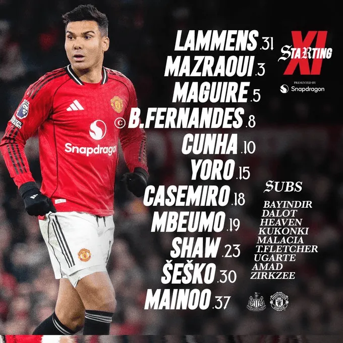 曼联替补:1-巴因迪尔、2-达洛特、11-齐尔克泽、12-马拉西亚、16-阿玛德-迪亚洛、25-乌加特、26-海文、39-泰勒-弗莱彻